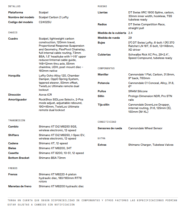 La Scalpel 2 Lefty es una bicicleta de XC ligera, rápida y emocionante, capaz de ganar carreras o simplemente desdibujar el camino. La suavidad y precisión inigualables de la horquilla Lefty Ocho se complementan a la perfección con el agarre y la eficiencia del cuadro de carbono FlexPivot. El nuevo grupo XT Di2 de Shimano realiza los cambios con precisión digital, mientras que los frenos de 4 pistones resisten incluso los descensos más complicados. Con las suaves ruedas de carbono XRC 1900 de DT Swiss y una tija telescópica DownLow, está lista para alcanzar la velocidad de XC dondequiera que montes.