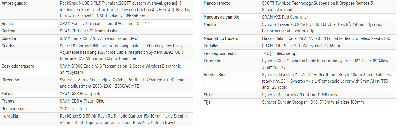 La Spark RC Team es la mezcla perfecta de ingeniería de vanguardia en carbono, unos niveles de integración nunca vistos hasta ahora y la cantidad exacta de nuestra salsa secreta. Queríamos que esta bicicleta fuera más veloz tanto en los ascensos como en los descensos. Hemos alargado el recorrido de la suspensión, hemos perfeccionado la geometría y hemos hecho caso a los mejores deportistas del mundo para crear la bicicleta de carreras de cross country definitiva. Si te apasiona la velocidad, esta montura te va a encantar.