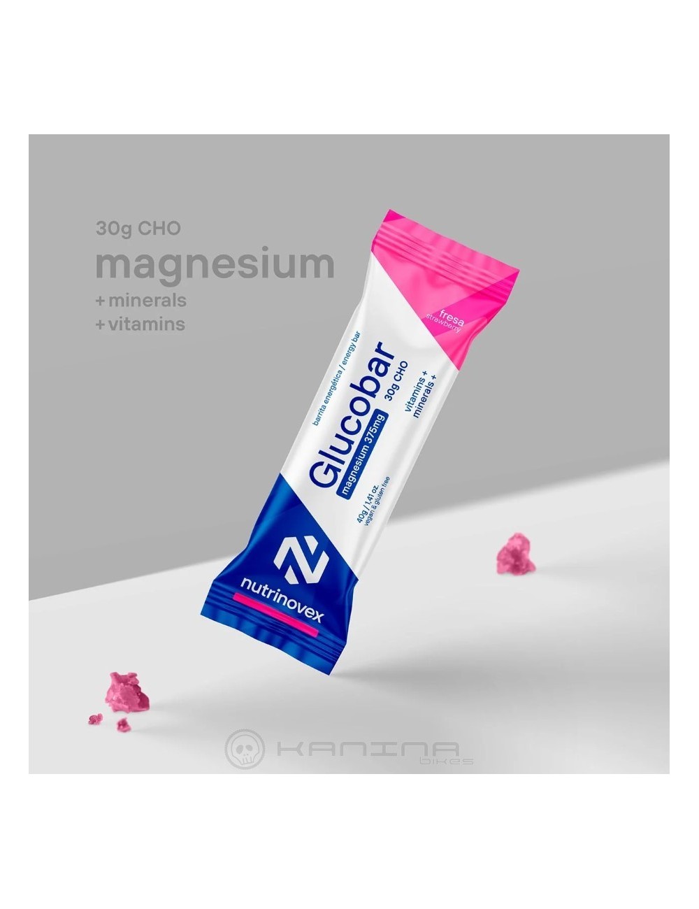 Glucobar es una barrita energética a base de pulpa de fruta enriquecida con Magnesio (375mg – 100% VRN), Glutamina, Carnitina, Potasio y Vitaminas (B1, B2, B3, B6 y D3).