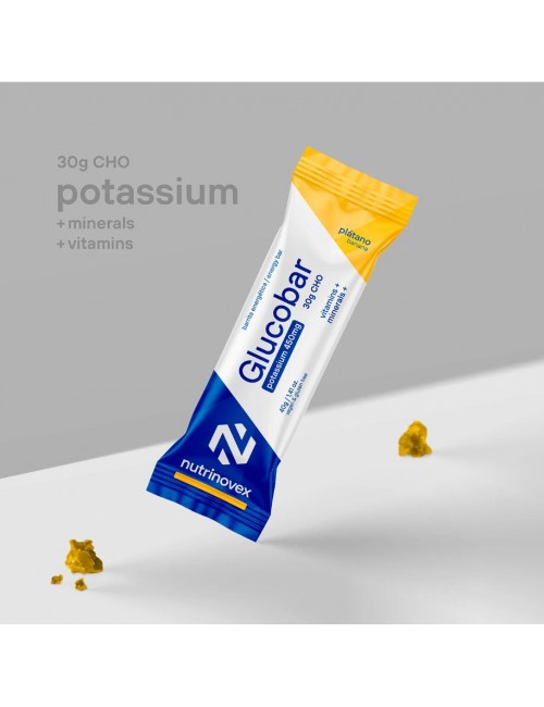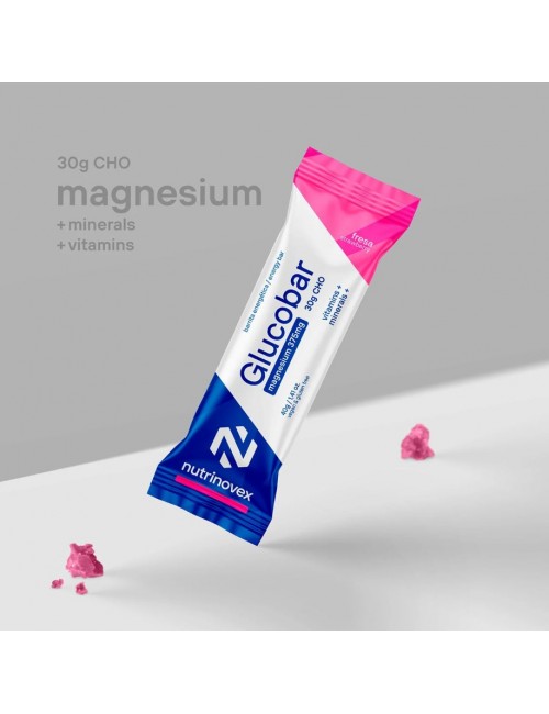 Glucobar es una barrita energética a base de pulpa de fruta enriquecida con Magnesio (375mg – 100% VRN), Glutamina, Carnitina, Potasio y Vitaminas (B1, B2, B3, B6 y D3).